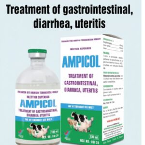 Ampicol is a broad-spectrum antibiotic containing ampicillin and colistin, effective against respiratory, intestinal, urinary, and septicemic infections in livestock and poultry. It targets E. coli, Salmonella, Pasteurella, and Staphylococcus species. Contact Us for Price