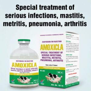 Amoxicla is a broad-spectrum antibiotic combining amoxicillin and clavulanic acid. It is used in livestock and pets to treat respiratory, urinary, gastrointestinal, skin, and soft tissue infections caused by E. coli, Staphylococcus, and Pasteurella species. Contact Us for Price