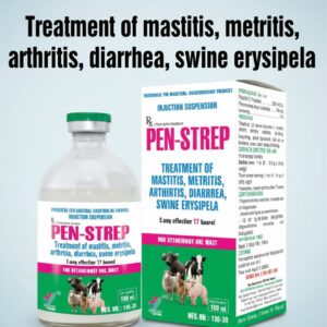Pen-Strep is a combination of procaine penicillin and dihydrostreptomycin, effective against a wide range of Gram-positive and Gram-negative bacteria. It is used in cattle, sheep, goats, pigs, and dogs for treating respiratory infections, mastitis, metritis, navel ill, and septicemia. Contact Us for Price