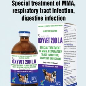 Oxyvet 200 L.A is a long-acting oxytetracycline antibiotic used in cattle, sheep, goats, and pigs for the treatment of bacterial infections such as pneumonia, mastitis, metritis, foot rot, and enteritis caused by Pasteurella, Streptococcus, and E. coli species. Contact Us for Price