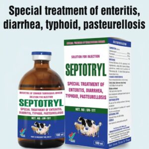 Septotryl is a combination of sulfadiazine and trimethoprim, providing broad-spectrum antibacterial action. It is indicated for respiratory infections, enteritis, mastitis, metritis, urinary tract infections, and septicemia in cattle, sheep, goats, pigs, and dogs. Contact Us for Price
