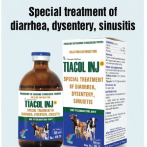 Tiacol Injection contains tylosin and colistin, providing strong antibacterial action against respiratory, intestinal, and systemic infections in livestock and poultry. It is effective against Mycoplasma, E. coli, Salmonella, and Pasteurella species causing CRD, enteritis, and septicemia. Contact Us for Price