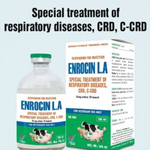 Enrocin L.A is a long-acting fluoroquinolone antibiotic containing enrofloxacin. It is used in cattle, sheep, goats, and pigs for the treatment of respiratory, urinary, gastrointestinal, and systemic infections caused by E. coli, Pasteurella, Mycoplasma, and Salmonella species. Contact Us for Price